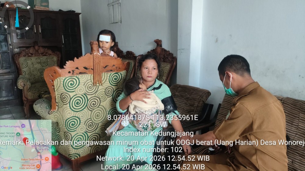 Dalam upaya meningkatkan kepatuhan pengobatan dan pemantauan kondisi pasien dengan gangguan jiwa, petugas kesehatan dari Puskesmas Kedungjajang melaksanakan kunjungan rumah pada hari Senin, 20 April 2026.